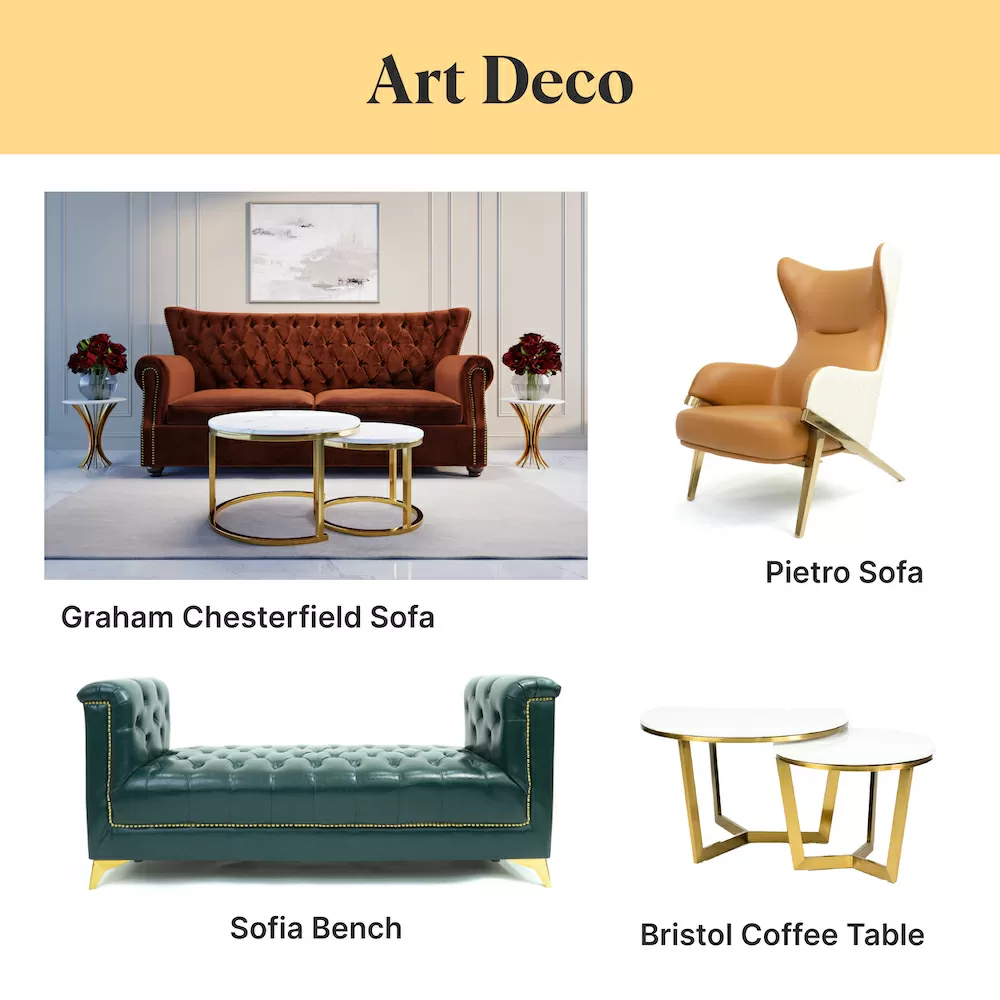 Art Deco motifs include zigzag patterns, tufted furniture, and jagged, pointed edges inspired by skyscrapers. The use of gold, steel, mirror, chrome, glass, lacquer, and upscale upholstery fabrics such as shark, velvet, and zebra skin epitomises the Art Deco aesthetic. Furnishings are streamlined and large in scale, without intricate detailing. Examples of Art Deco furniture pieces include the Graham Chesterfield Sofa, Sofia Bench, Pietro Chair, and Bristol Coffee Table.